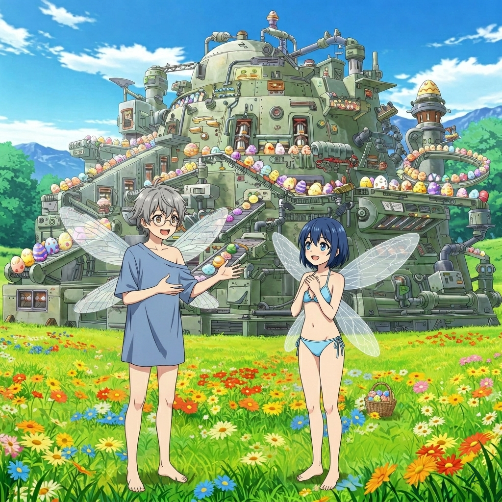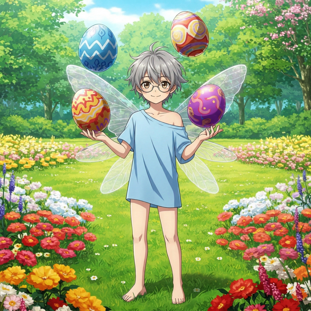 Die Frühlingssonne schien klar über das Feenland, und alles blühte in den schönsten Farben. Bunte Blumen wiegten sich im Wind, Schmetterlinge tanzten in der Luft – und mitten auf der großen Blumenwiese stand Darin. Barfuß, mit glänzenden Feenflügeln auf dem Rücken und einem breiten Grinsen im Gesicht. Um ihn kreisten vier riesige Ostereier, die er gekonnt jonglierte.