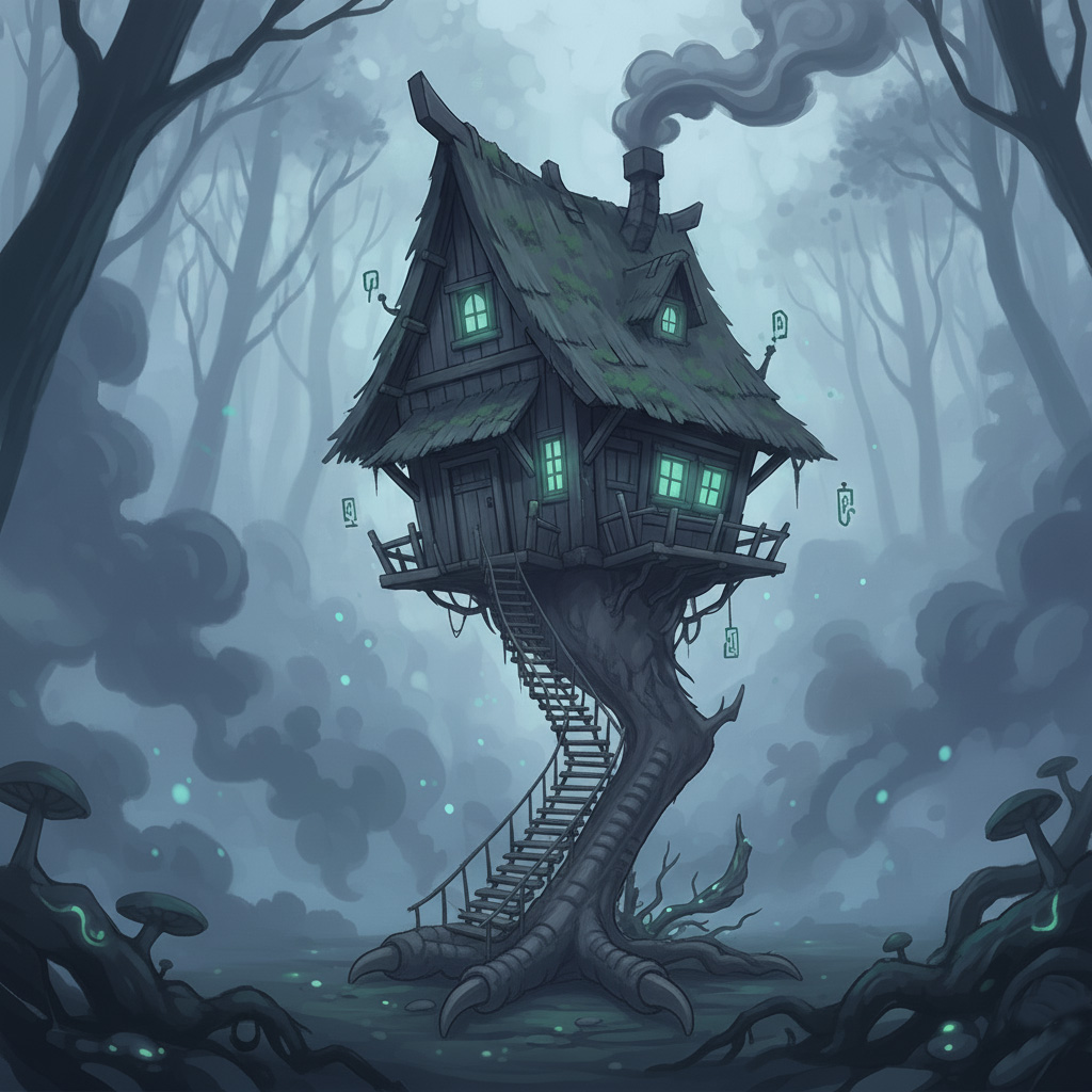 Sie tasteten sich vorwärts, bis sie plötzlich gegen etwas stießen. Es war morsch und… stand seltsam. Als der Nebel sich für einen Moment lichtete, sahen sie ein windschiefes Haus, das tatsächlich auf einem gigantischen, knochigen Hühnerbein stand.