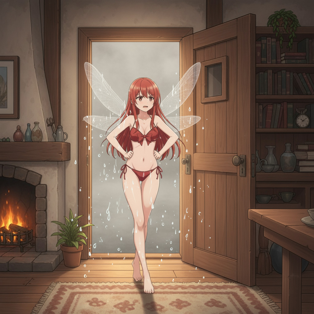 Sie landete auf dem Wohnzimmerteppich und versuchte vergeblich, ihre Elfenflügel trocken zu schütteln.