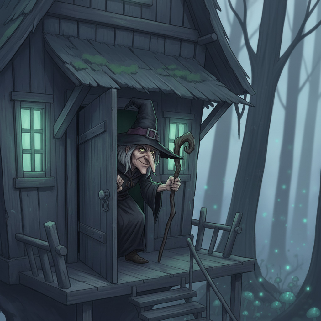 Schließlich öffnete sich die Tür einen Spalt. Erst sah man nur eine sehr lange, krumme Nase, dann einen klassischen, spitzen Hexenhut und schließlich den Prototyp einer Hexe. Sie funkelte sie aus roten Augen an.