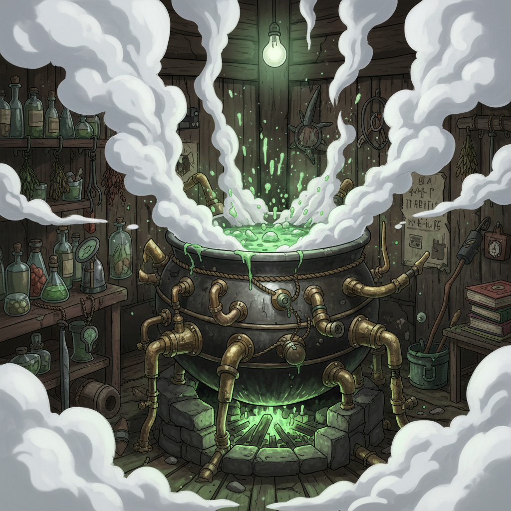 Die Hexe führte Darin in einen Verschlag, der aussah wie eine alchemistische Katastrophe. In der Mitte stand ein riesiger, gusseiserner Kessel, der bebte, pfiff und aus jedem Ventil Unmengen an Dampf ausstieß.