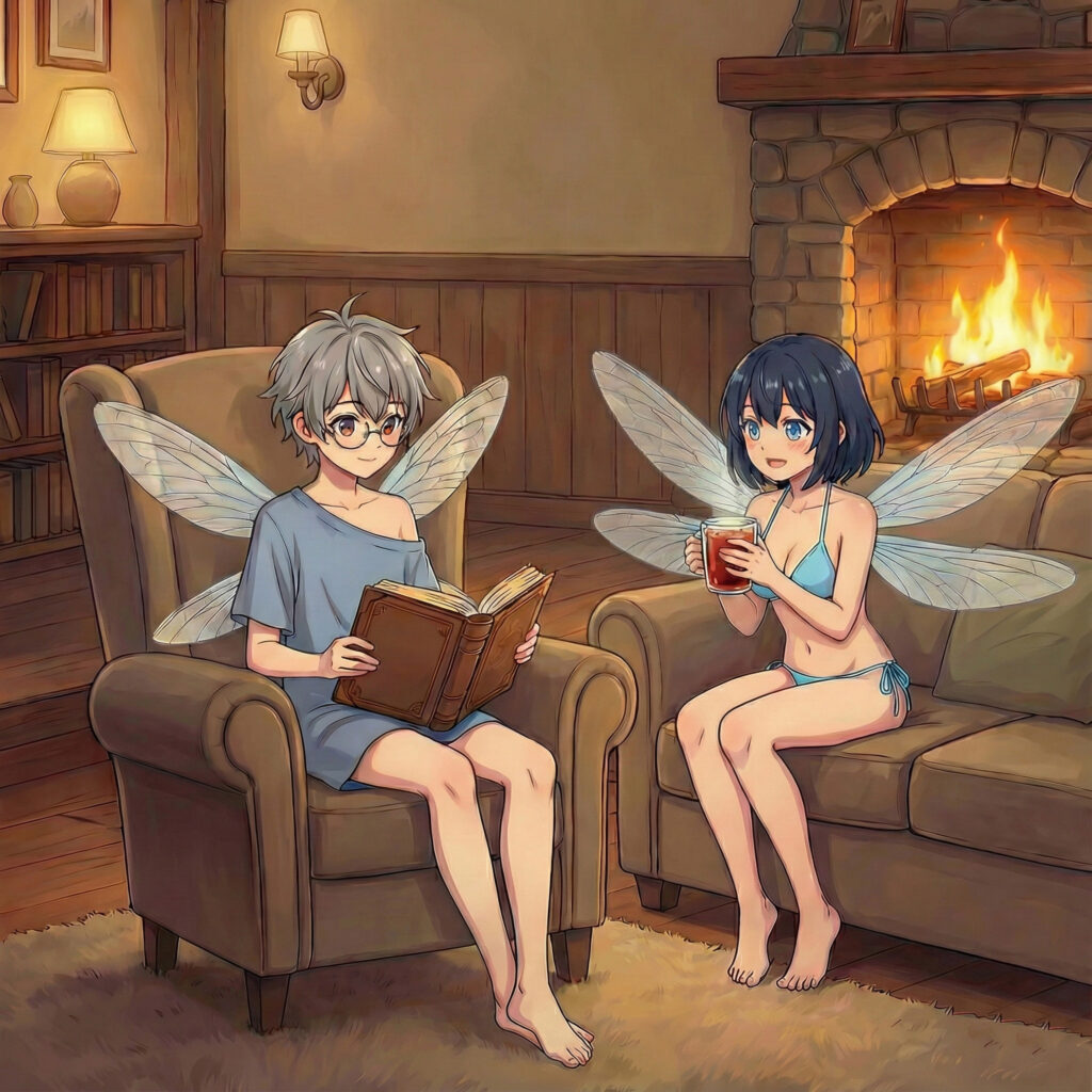 Funny saß auf dem Sofa, die dunkelblauen Haare glänzten im Feuerschein und sie hielt eine Tasse mit dampfendem Winterpunsch in beiden Händen. Darin saß im Sessel gegenüber, ein Buch über antike Runenmagie auf den Knien, seine Brille rutschte langsam die Nase hinunter. Es war perfekt. Friedlich. Harmonisch.