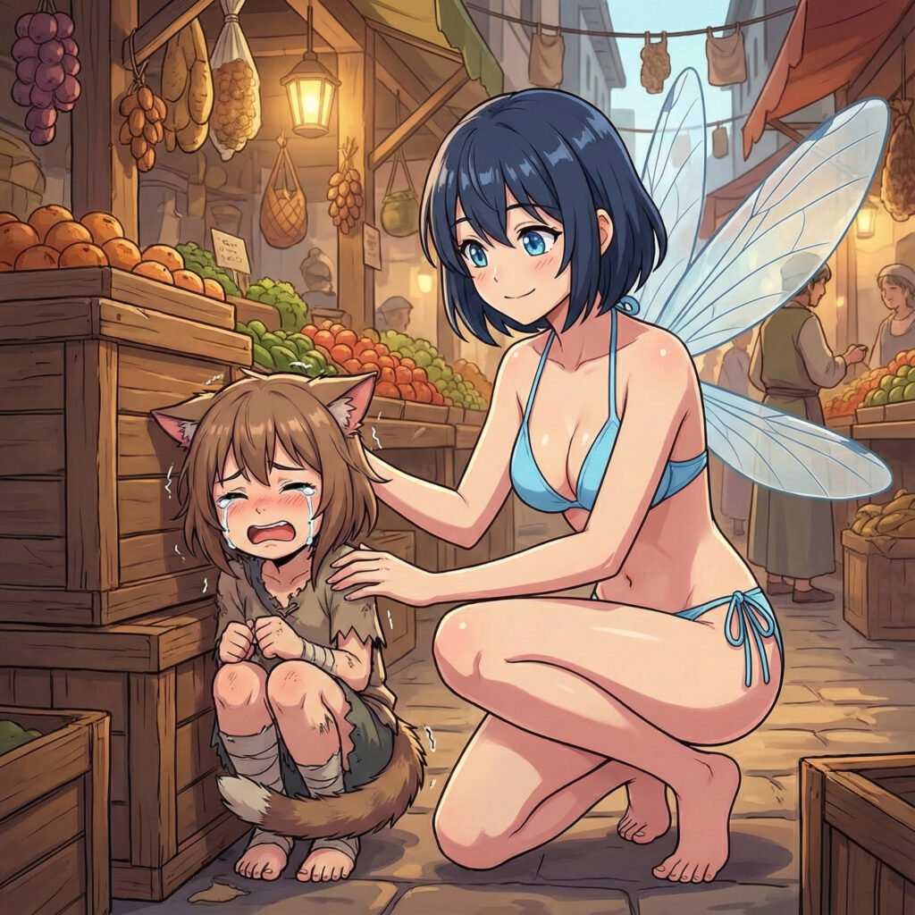 Draußen war es inzwischen dunkel geworden. Die Lichter des Marktes strahlten nun umso heller. Plötzlich hämmerte es gegen die Tür. Eine Katzenmenschen-Frau stürzte herein, die Augen weit aufgerissen, Tränen in den Augen.
