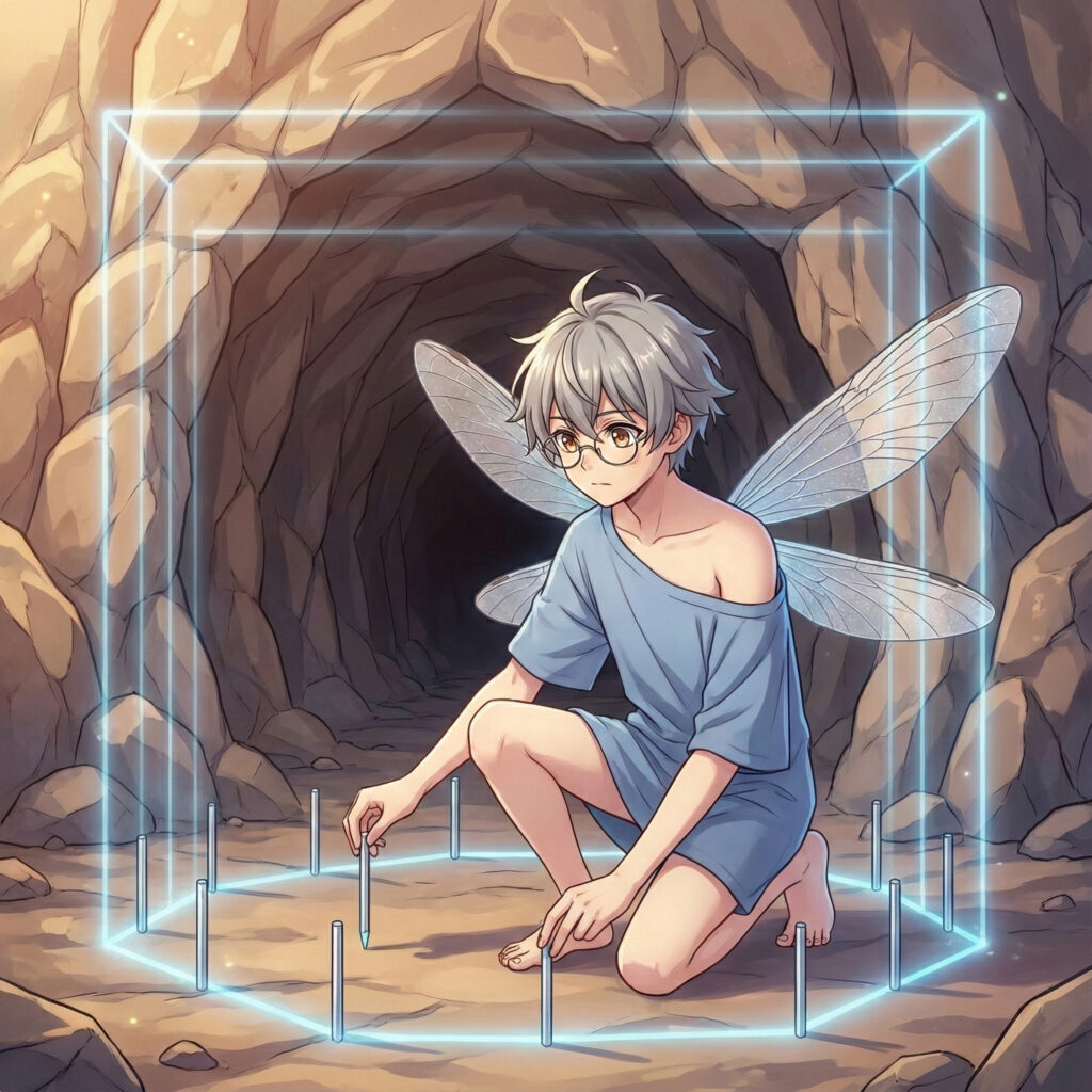 Er stellte die Itembox ab und öffnete sie. Mit der Präzision eines Uhrmachers begann er, rund um den Höhleneingang kleine, silberne Stäbe in den Boden zu stecken, die im Kreis angeordnet waren. Jeder Stab begann leise zu summen und projizierte ein schwaches Gitter aus blauem Licht.
