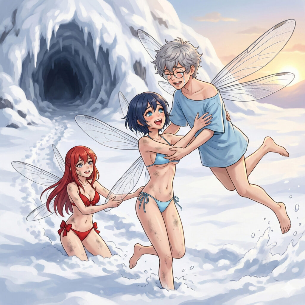 Tigra trat zu den drei Blumenelfen, die sich gegenseitig haltend im Schnee saßen.