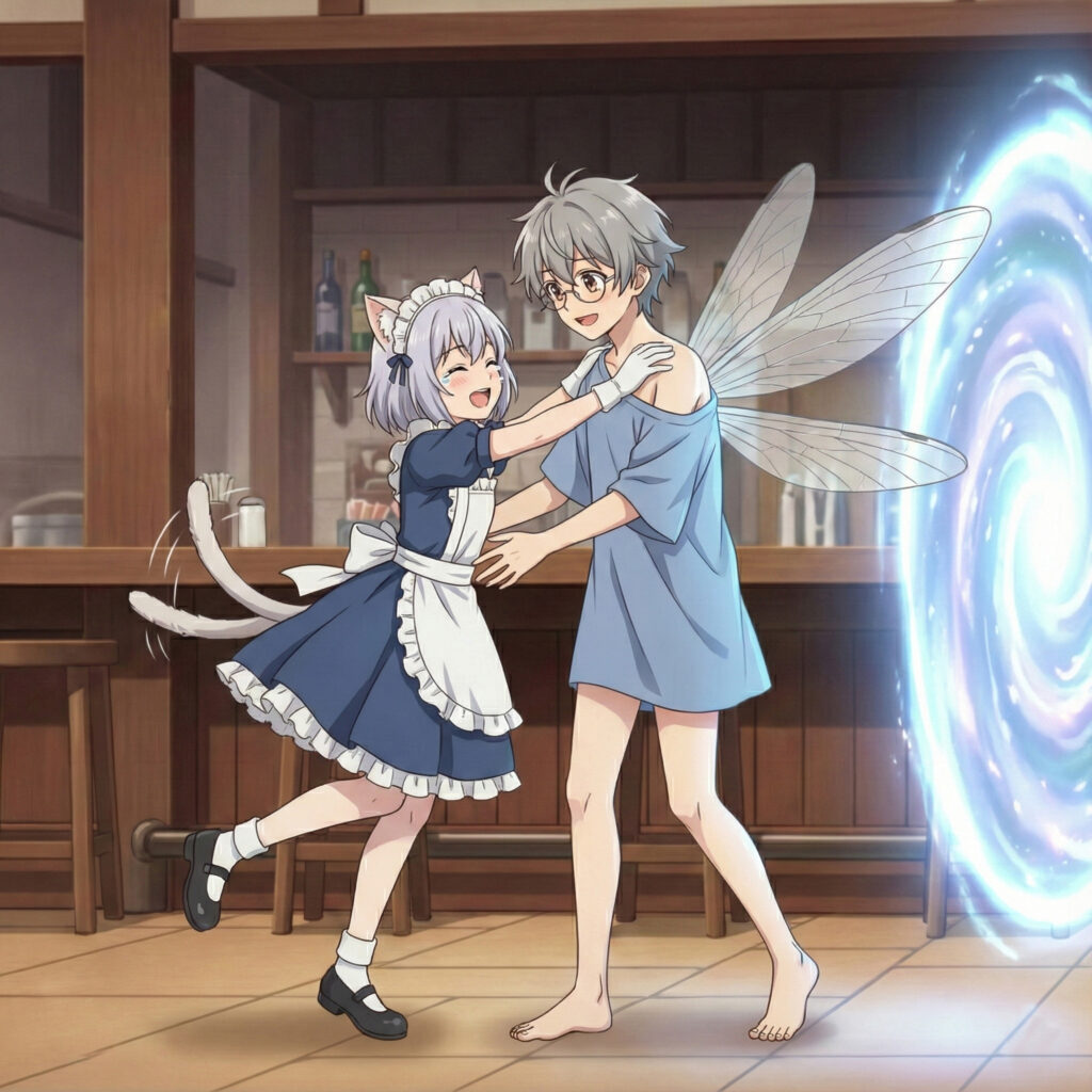 Darin erschien mitten in der Mensa der Akademie. Kaum war er durch das Portal getreten, hörte er ein lautes, freudiges „Miau!“ – und hatte sofort ein niedliches Katzenmädchen um seinen Hals hängen.