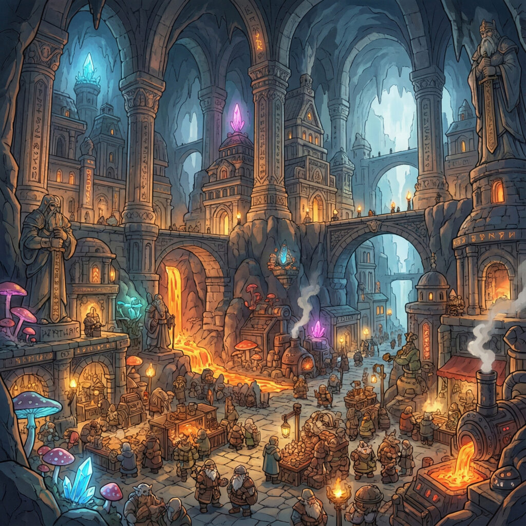 Der Flug nach Petra-Dura (Harter Fels) dauerte nicht lang. Die Stadt war weniger eine Mine als vielmehr das kulturelle Zentrum des Zwergenvolkes. Gigantische Hallen, direkt in den harten Fels gehauen, prächtige Säulen und belebte Marktplätze unter der Erde zeugten von meisterhafter Baukunst.