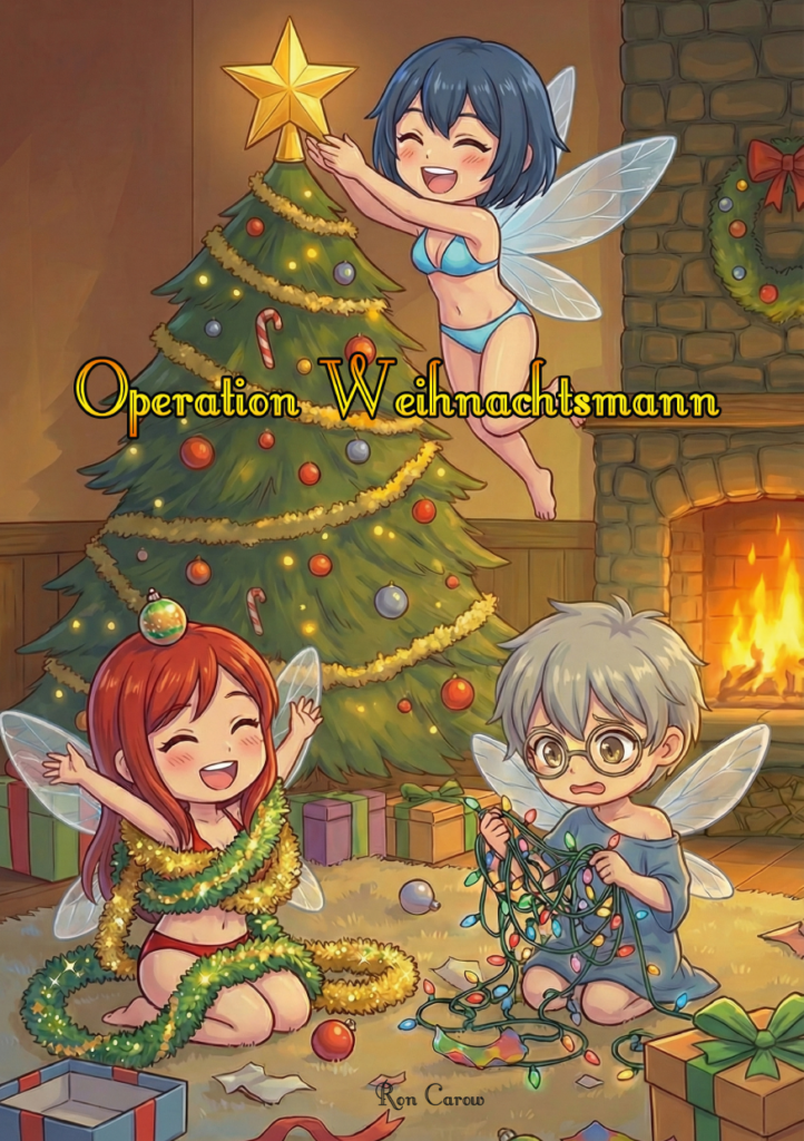 In der Mitte des Wohnzimmers stand ein riesiger Weihnachtsbaum, der darauf wartete, seine volle Pracht zu entfalten. Funny schwebte nahe der Zimmerdecke und versuchte, den goldenen Stern exakt mittig auf die Spitze zu setzen – eine Aufgabe, die sie mit militärischer Präzision anging. Darin kniete am Boden und kämpfte einen aussichtslosen Kampf gegen ein Knäuel aus Lichterketten.