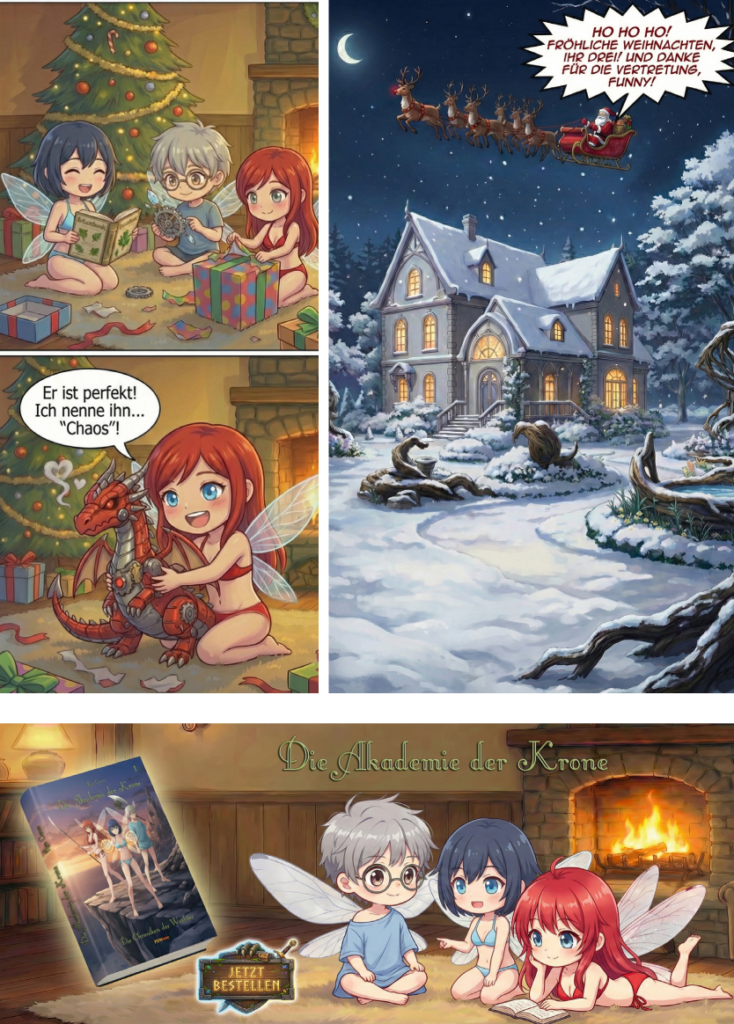 Die drei Freunde saßen noch lange zusammen, umgeben von Geschenkpapier, aßen Plätzchen und genossen den Frieden. Und während im WG-Häuschen die Lichter warm leuchteten, zog hoch oben am sternenklaren Himmel, unbemerkt von allen, ein echter Rentierschlitten seine Bahn über das Dach. Der Weihnachtsmann blickte hinab und lächelte.