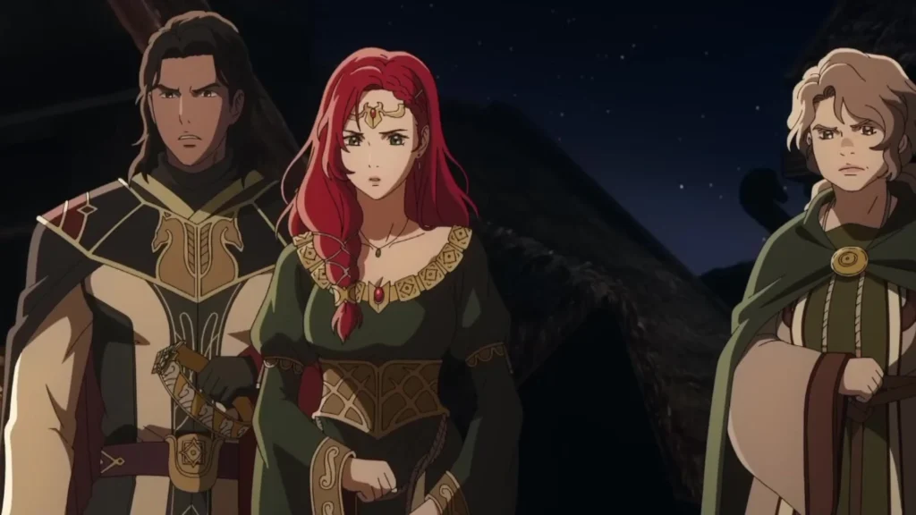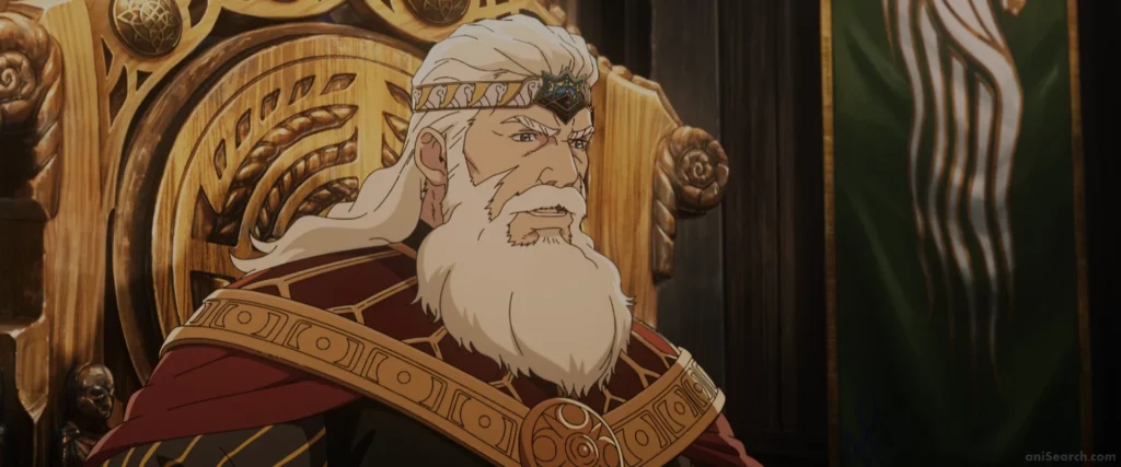Die visuellen Referenzen sind akribisch. Edoras und die Goldene Halle Meduseld sind sofort wiederzuerkennen, wirken jedoch jünger und weniger von der Zeit gezeichnet als in Die Zwei Türme. Die Festung Hornburg wird in ihrer ursprünglichen Pracht gezeigt, bevor sie durch Jahrhunderte der Vernachlässigung jene Patina ansetzte, die wir aus den Jackson-Filmen kennen. Diese architektonische Kontinuität verankert den Anime fest im etablierten filmischen Universum.