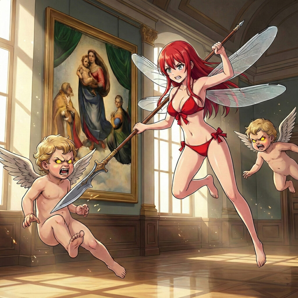 Funny nickte, doch sie hatte keine Zeit für lange Abschiede. Ein gellendes Lachen erfüllte den Saal. Aus der Leinwand schossen zwei nackte Gestalten – die berühmten zwei Putten-Engel vom unteren Bildrand! Doch sie sahen nicht mehr friedlich aus. Ihre Augen glühten gelb, und sie fletschten kleine, spitze Zähne.