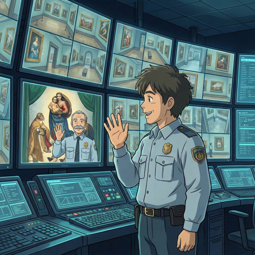 Auf dem Bildschirm war Ralph zu sehen, ein erfahrener Wachmann, der gerade den Saal der Sixtinischen Madonna betreten hatte. Ralph war bekannt dafür, dass er keinem Bild so viel Aufmerksamkeit schenkte wie diesem. Er blieb vor dem gewaltigen Werk von Raffael stehen, korrigierte seine Mütze und winkte freundlich direkt in Franks Kamera. Frank lachte kurz auf. Er wusste, dass Ralph ihn nicht sehen konnte, aber es war ein liebgewonnenes Ritual zwischen den beiden.