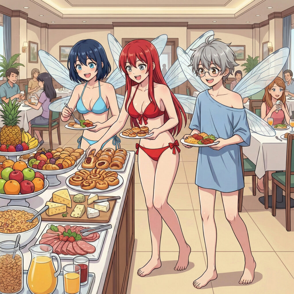 Doch dort änderte sich die Stimmung schlagartig. Für Blumenelfen war ein Hotel-Frühstücksbuffet so etwas wie der heilige Gral der Kulinarik.