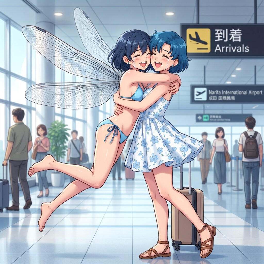 Ami, mit ihren kurzen dunkelblauen Haaren und einem strahlenden Lächeln, winkte wild. Funny rannte auf sie zu, und die beiden fielen sich in die Arme. Durch die Kompensationsmagie sah Funny für die restlichen Menschen am Flughafen wie eine normale, sehr elegante europäische Touristin aus. Für Ami jedoch war sie einfach ihre beste Freundin aus einer anderen Welt.
