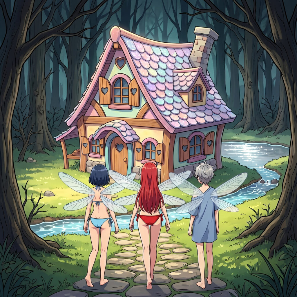 In der Mitte der Senke plätscherte ein kristallklarer Bach, der in einen kleinen, silbernen See mündete. Doch das Verwunderlichste war das Gebäude, das dort stand. Es bot einen absoluten, fast schon schmerzhaften Kontrast zum dunklen, verwitterten Albtraumwald: Ein kleines, zweistöckiges Häuschen, so bunt, rund und seltsam knuffig, dass es wirkte, als wäre es geradewegs aus einem Märchenbuch für Kleinkinder gefallen. Die Fensterläden waren herzförmig, das Dach schimmerte in sanften Pastellfarben und der Schornstein hatte eine leichte Schieflage.
