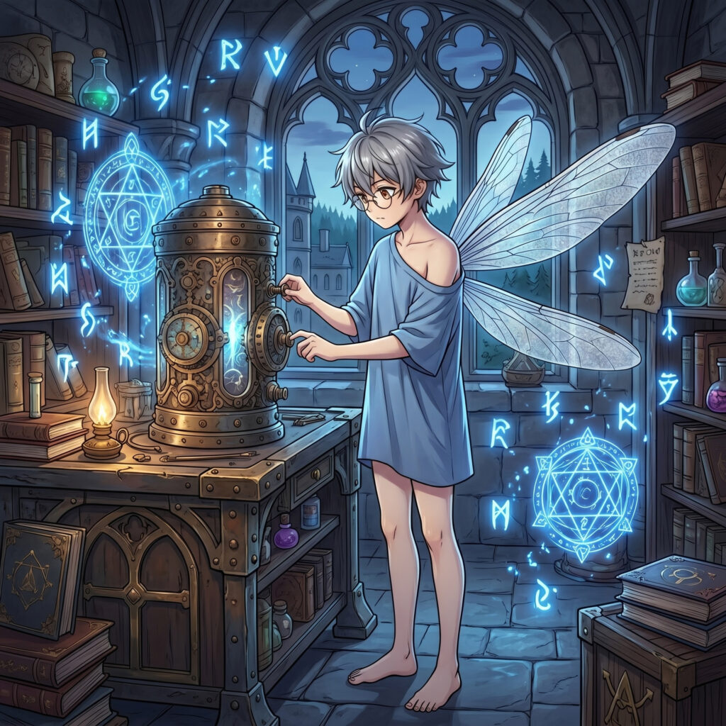Darin, der am Vortag noch weise vorausschauend Miri gebeten hatte, Lily pünktlich aus den Federn zu holen, war selbst schon vor Sonnenaufgang in sein Element abgetaucht. Er stand vor einem komplexen Versuchsaufbau. Blaue Runen schwebten flirrend in der Luft, während er an einem metallischen Zylinder Parameter feinjustierte und magische Fluktuationen künstlich verzögerte. Er war so tief in die Matrix aus Magie und Technik versunken, dass die reale Welt für ihn aufgehört hatte zu existieren.