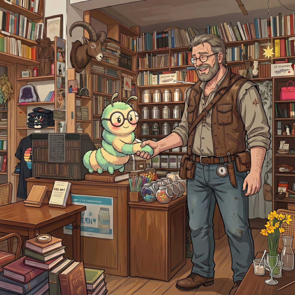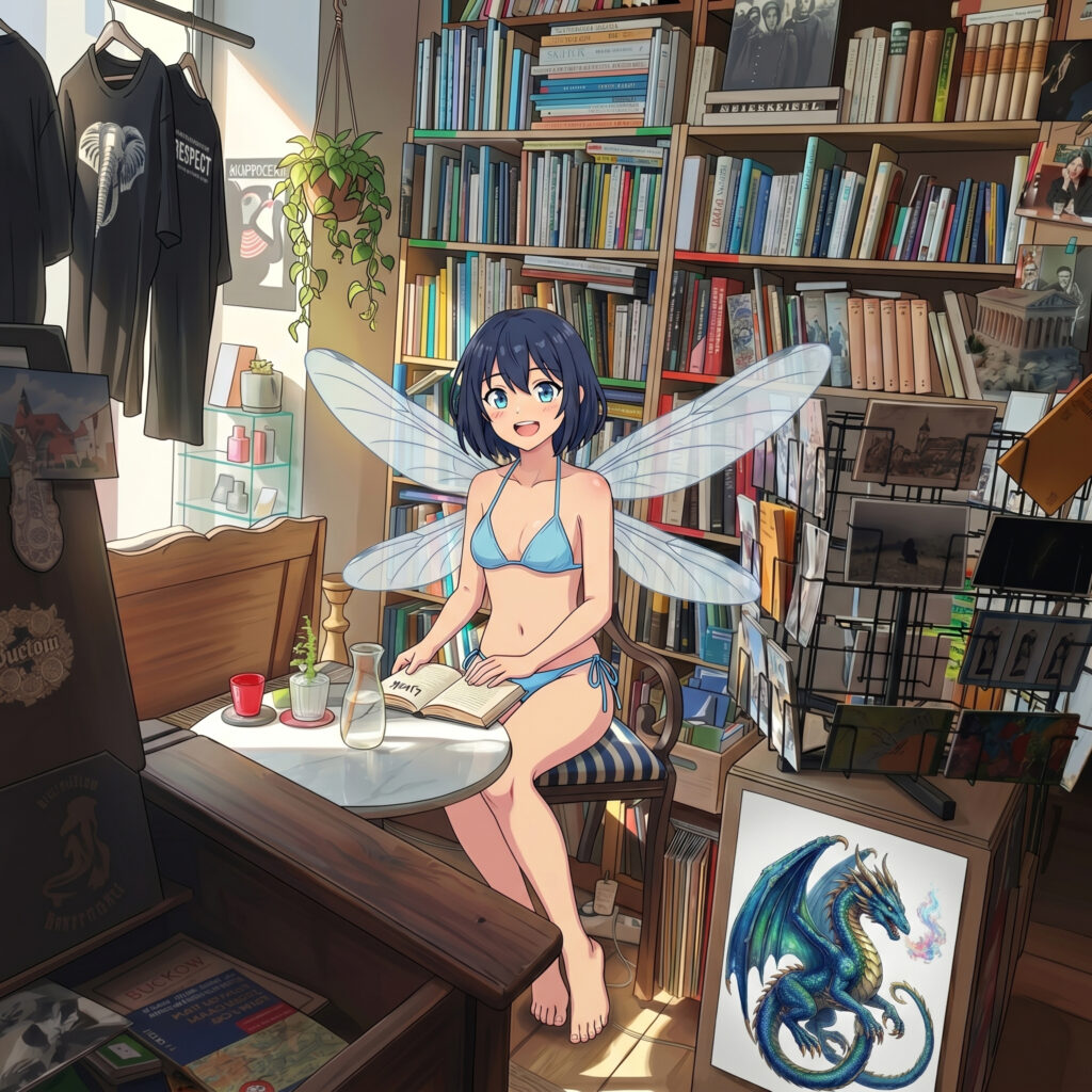 „Okay, stoppt mal diesen Buch-Nerd-Talk! Warum machst du es nicht einfach wie Funny? Geh zu Olli in den Laden, setz dich in seine super gemütliche Lese-Ecke, friss – ich meine, lies – ein Buch vor Ort und trink dazu einen seiner leckeren Tees? Das kostet dich höchstens ein paar läppische Kupferlinge!“