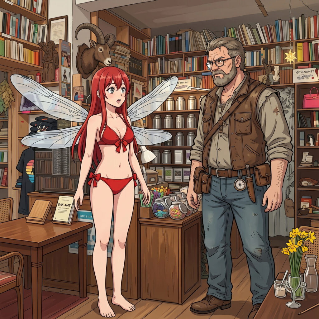 Olli, der gerade dabei war, ein Regal abzustauben, drehte sich um. Er bekam Augen so groß wie Wagenräder und ließ seinen Staubwedel fallen, als Darin anfing, einen makellosen Turm aus wertvollen Büchern nach dem anderen aus der Itembox neben den Ladentisch zu stapeln.