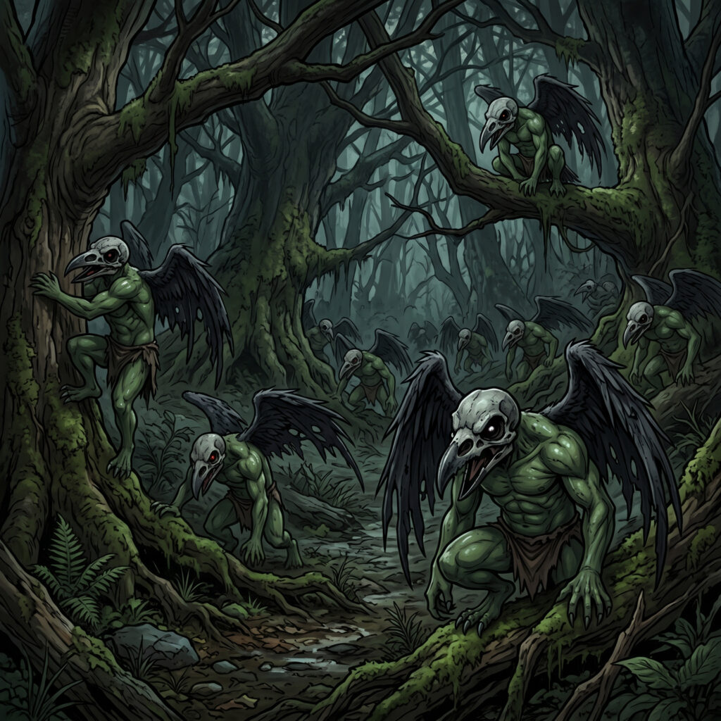 Es waren abstoßende Kreaturen. Sie besaßen die gedrungenen, muskulösen und glitschig-grünen Körper kleiner Orks, doch anstelle von Köpfen saßen ihnen riesige, aschgraue Krähenschädel auf den Schultern, deren Schnäbel bedrohlich klapperten. Aus ihren Rücken wuchsen pechschwarze Krähenflügel, die allerdings so zerfetzt, verkrüppelt und löchrig waren, dass diese Missgeburten der Natur die Fähigkeit zum Fliegen entweder längst verloren hatten oder nie besaßen.